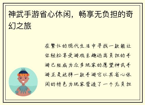 神武手游省心休闲,畅享无负担的奇幻之旅