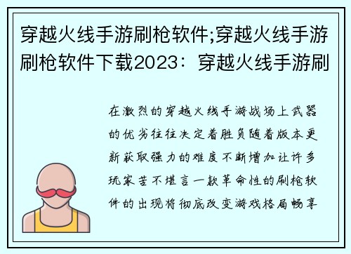 穿越火线手游刷枪软件;穿越火线手游刷枪软件下载2023:穿越火线手游刷枪神器,让你畅享战场霸主人生